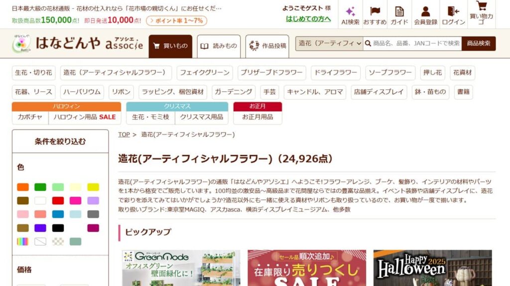 特徴と利用方法: 国内最大級のアーティフィシャルフラワー専門問屋です。高品質で信頼性の高い製品が揃っており、ウェディングやプロのディスプレイ業者に広く利用されています。会員登録することでプロ向けの価格での仕入れが可能になります。