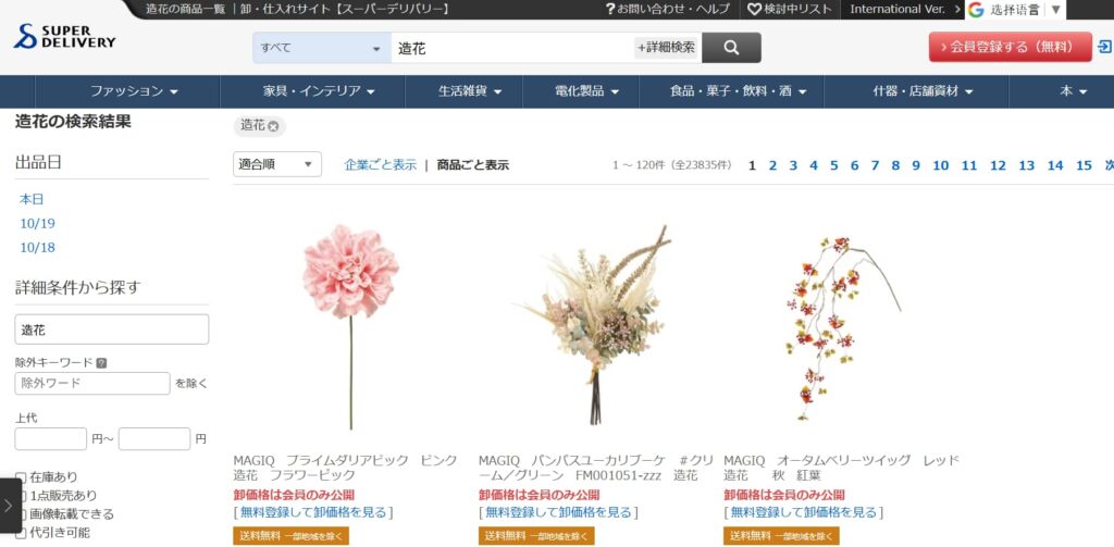 特徴と利用方法: 日本国内の複数のメーカーや卸問屋が出品するB2B卸モールです。造花だけでなく、雑貨、アパレルなど多岐にわたる商品が見つかります。少量からの仕入れに対応している業者が多いです。