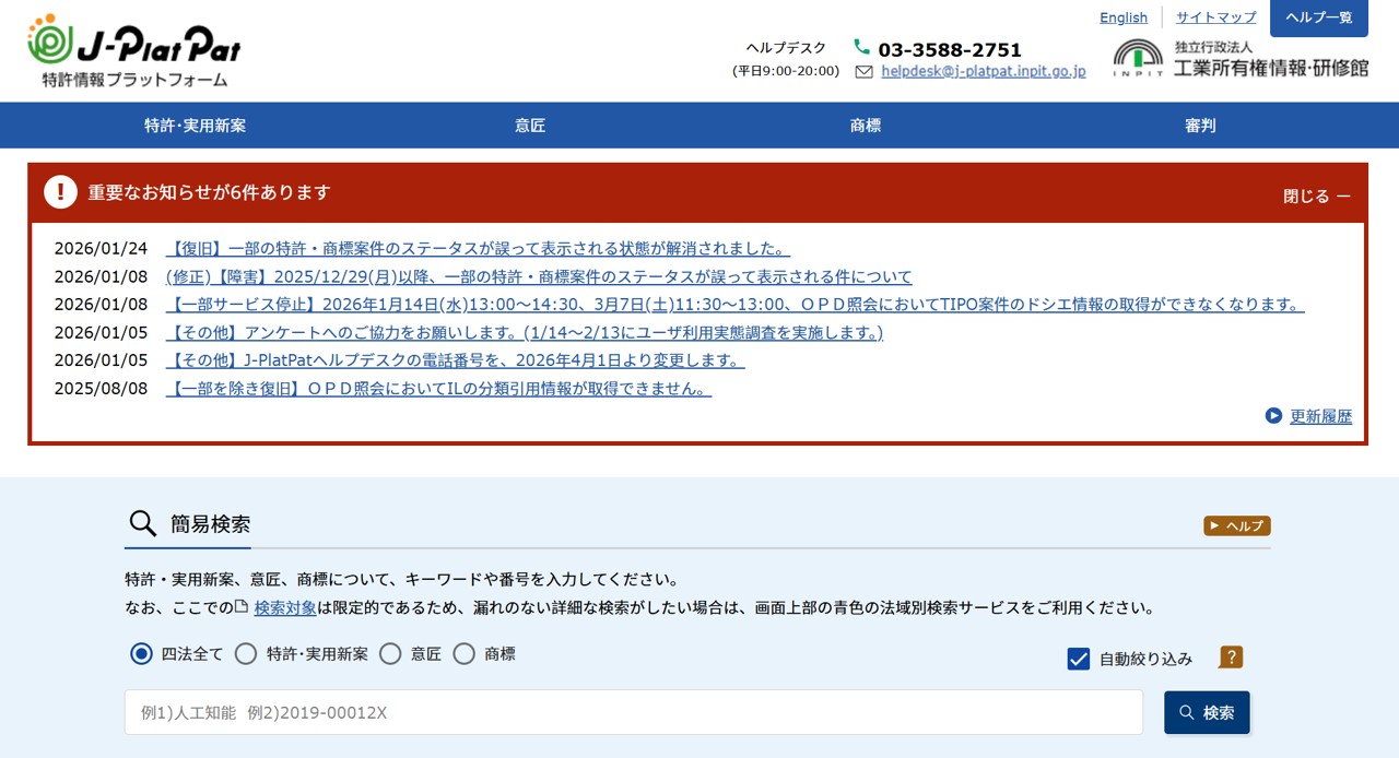 JPOのデータベースでは、発明特許、実用新案、意匠(外観デザイン)を重点的に確認します。