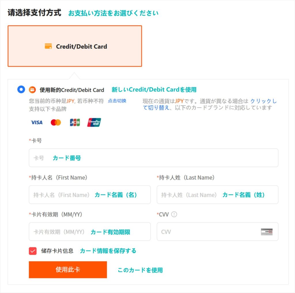 アリペイ(Alipay)に登録する必要はなく、注文画面にカード番号を入力するだけで決済できます。初心者にとって最も分かりやすい方法ですが、アリペイよりも支払い失敗率が高めです。