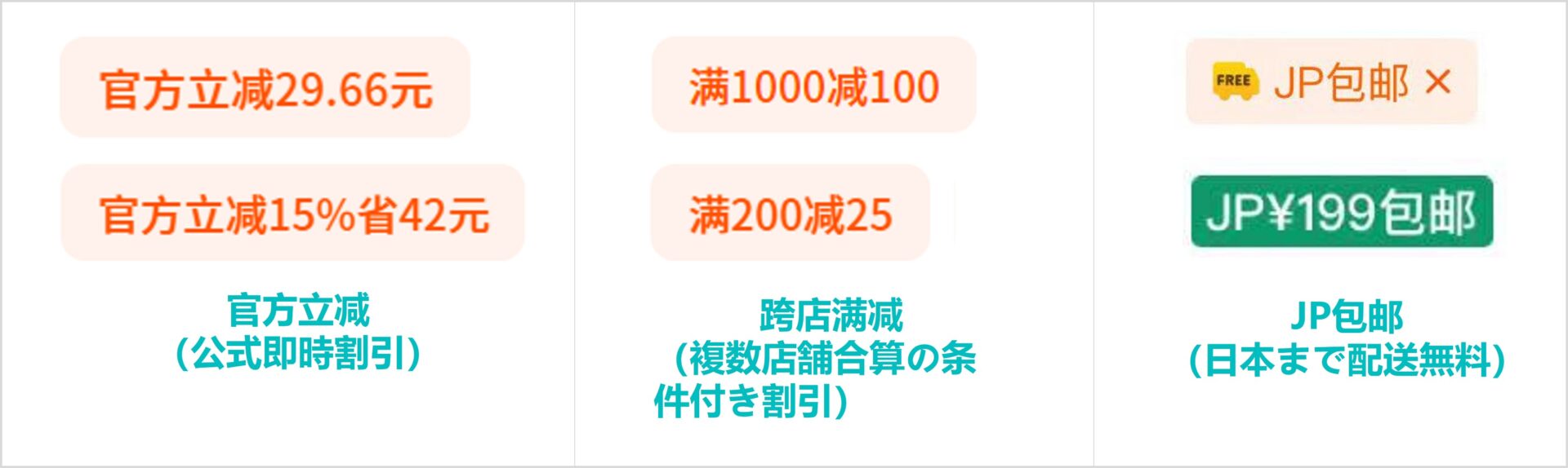 官方立减(公式即時割引):「官方X.X折」「官方立减XX元(公式即時割引)」の表示がある商品は、決済時に対応する割引金額が自動で差し引かれ、利用条件はありません。ただし、同じ店舗内でもすべての商品が参加しているわけではない点に注意が必要です。注文前に、商品詳細ページと最終的な注文確認ページの両方で、割引が適用されているか、支払金額が正しいかを再確認するのがおすすめです。