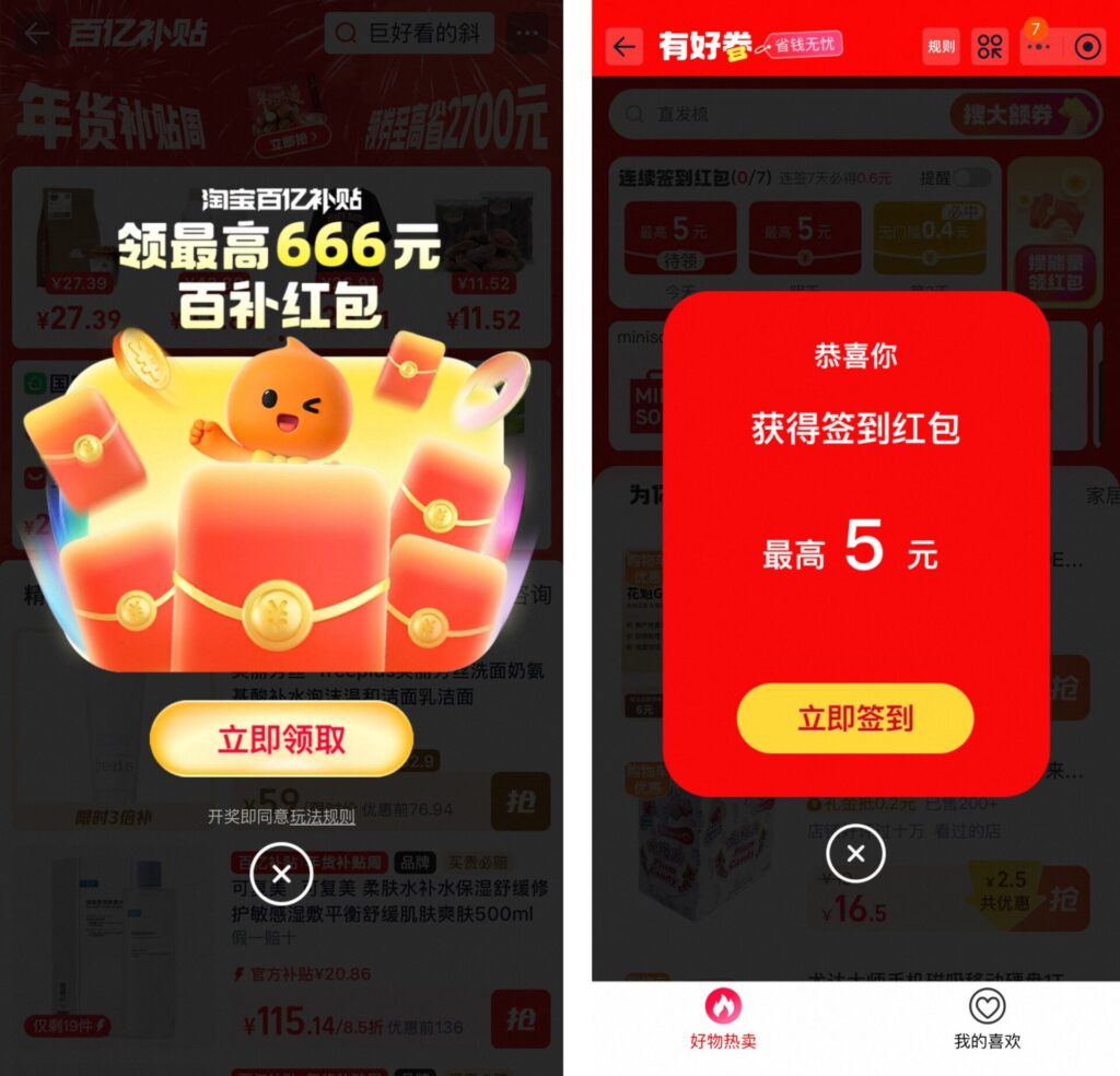 - 参加手順:タオバオを開く → 上部の検索バーをタップ → 红包口令(例:红包到手6688)を入力 → 「领取」をタップ → システムがランダム金額の利用条件なし红包を自動付与。