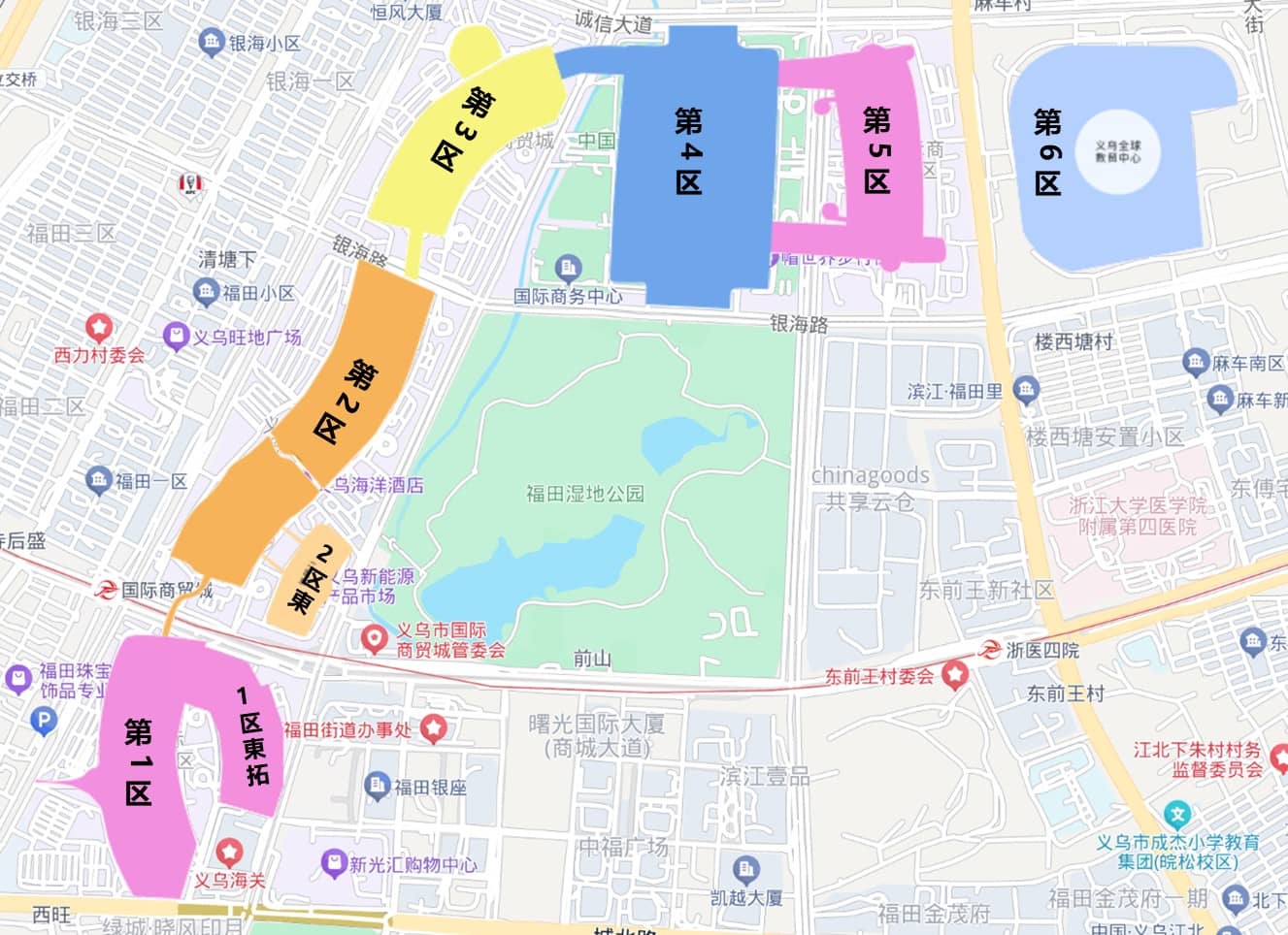 「義烏国際商貿城」は一般的に、中核となる5つの取引エリア(第1区〜第5区)を指します。加えて、2025年に新たに開業した第6区(義烏グローバル数貿センター)は、デジタル貿易(数貿)を担う次世代型の市場として注目されています。