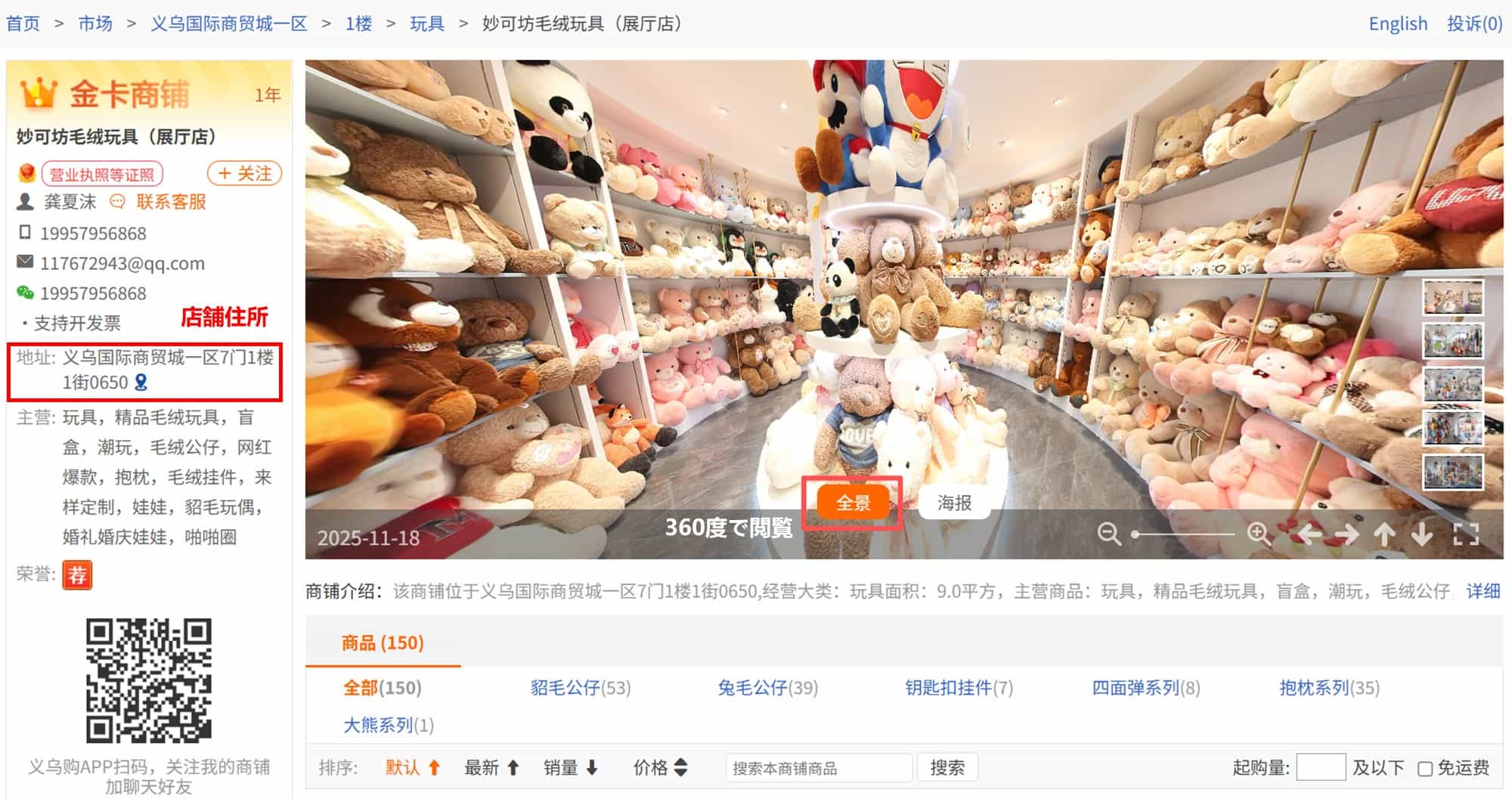 「義烏購」アプリで店舗名または番号を検索すると、詳細住所を確認できるだけでなく、「店舗全景」機能で店内を360度閲覧できます。
